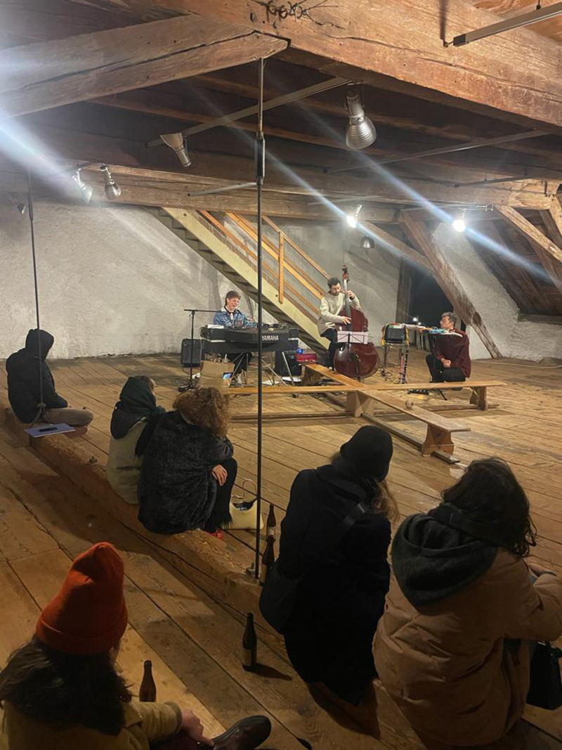 In the attic of KRONE COURONNE artist Gabriel Stöckli showed some of his latest works: Senza titolo [Untitled] (2023) is a series of sound sculptures that the artist conceived during his residency at Cité internationale des arts in Paris earlier this year. They are inspired, like many of Stöckli’s works, by the daily observation of his surroundings and their slow absorption. Domestic life, conviviality, irony, human intelligence – some of the issues that interest him the most – have been circumscribed, synthesized and returned in a new, unusual context. Taking inspiration from two sound sculptures by Gabriel Stöckli, musicians Marco Guglielmetti, Paul Pedrazzini and Matteo Simonin performed live on this evening. They started playing to the soundtrack of the sculpture Dream Operator, overlapping with it and then presented other compositions. There were snacks & beer during and following the concert.