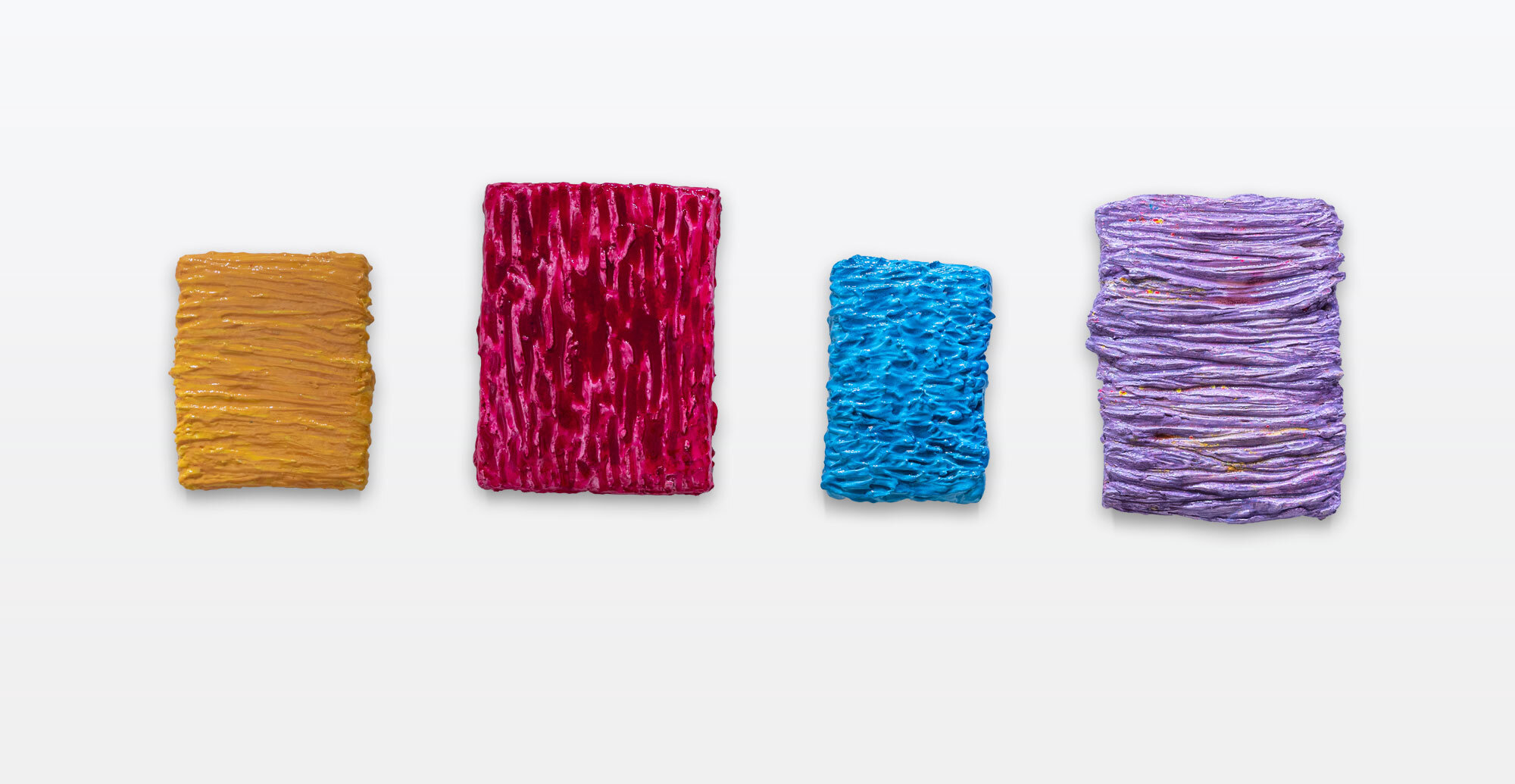 The artwork Cover is a wall sculpture consisting of four objects measuring 31 x 30 x 4 cm (yellow), 40 x 37 x 4 cm (pink), 32 x 23 x 3 cm (blue) and 44 x 37 x 4 cm (purple). They are mounted on the wall with nails.