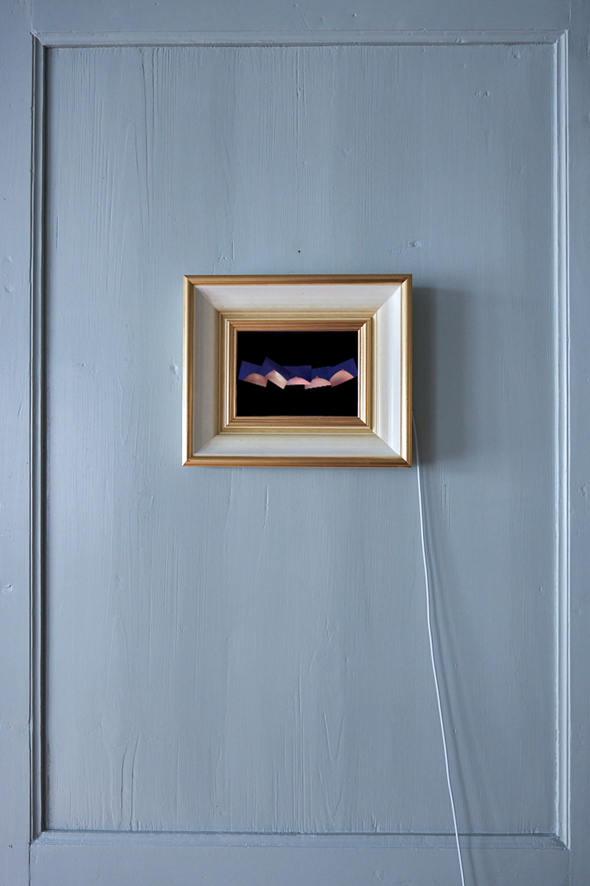 Video loop, iPad mini, iPad charging cable, wooden frame