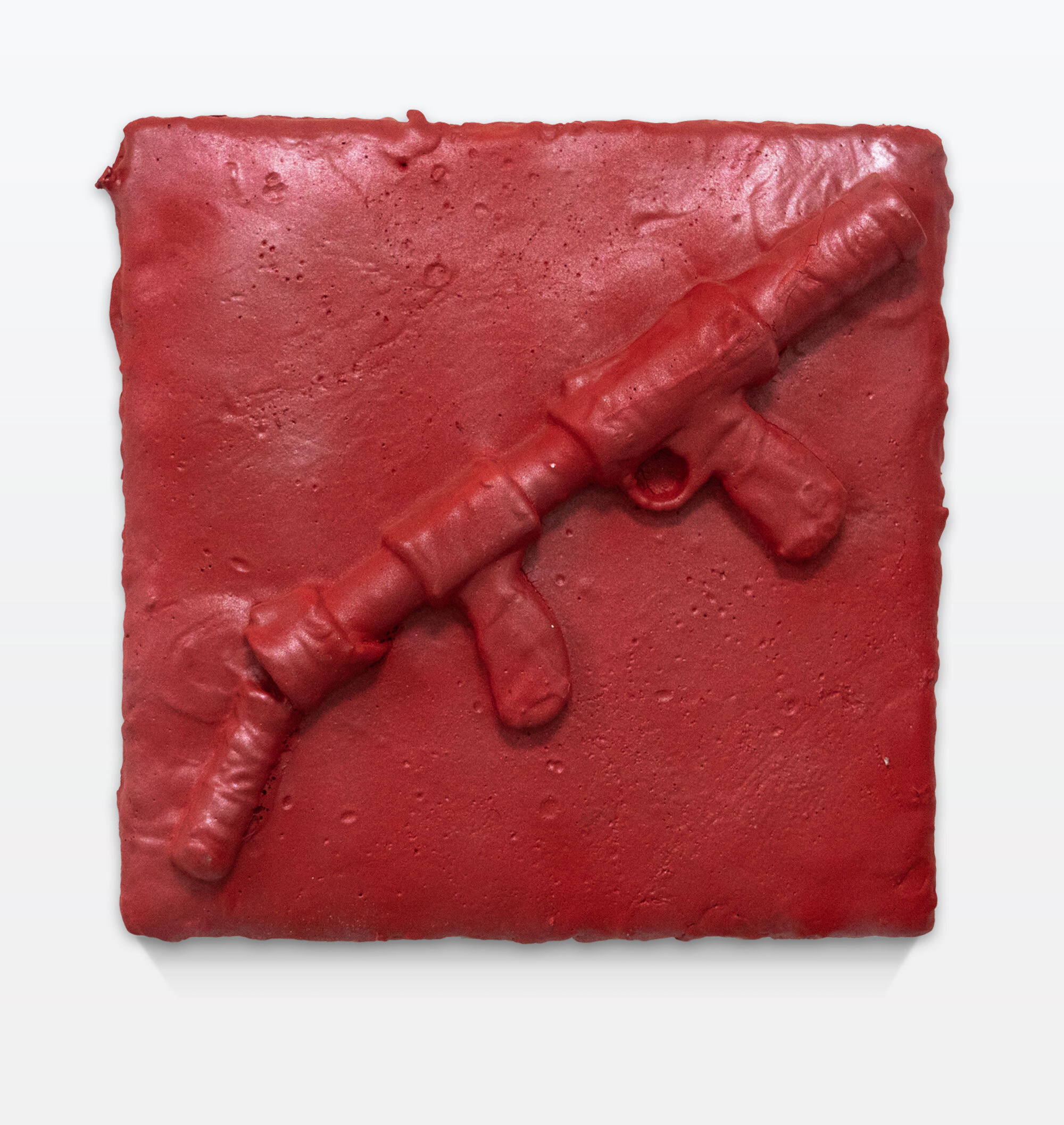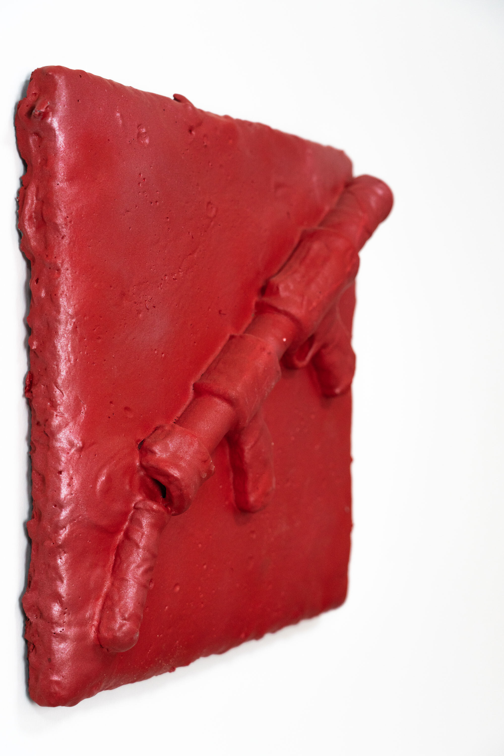 "For this piece, I started with a phallic shape from which I created a weapon-like form as a visual representation of the internalized pain of childhood loss due to abuse. I tend to cover toys with plaster to illustrate the act of hiding in a domestic place. I used red for this piece's surface to reflect violence, anger and aggression."