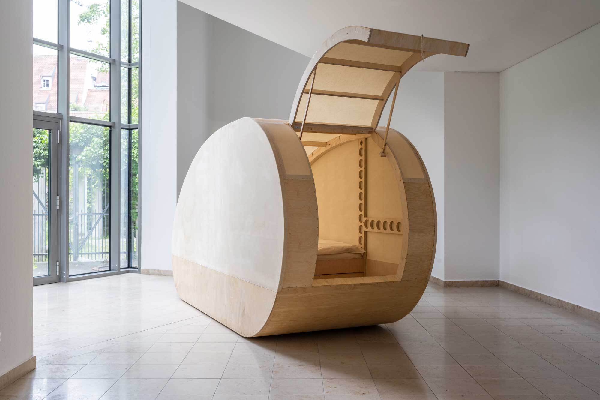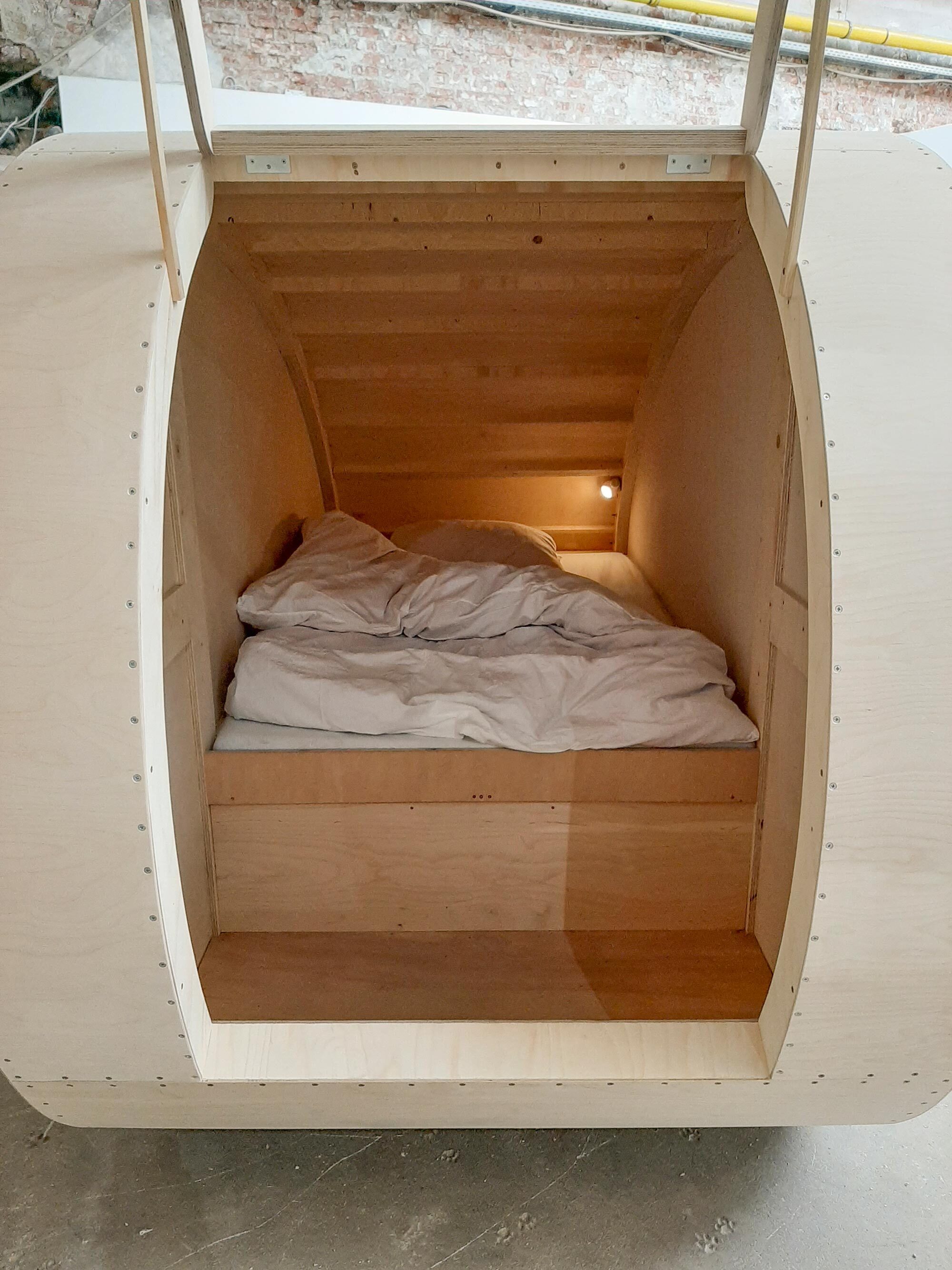 A shelter that is pulled or pushed and moved only by the muscle power of the person using it. Inside there is a full bed, which with a width of 120cm can accommodate another travel guest. The design also makes shorter stages over water possible. (Peter Zahel about this work)