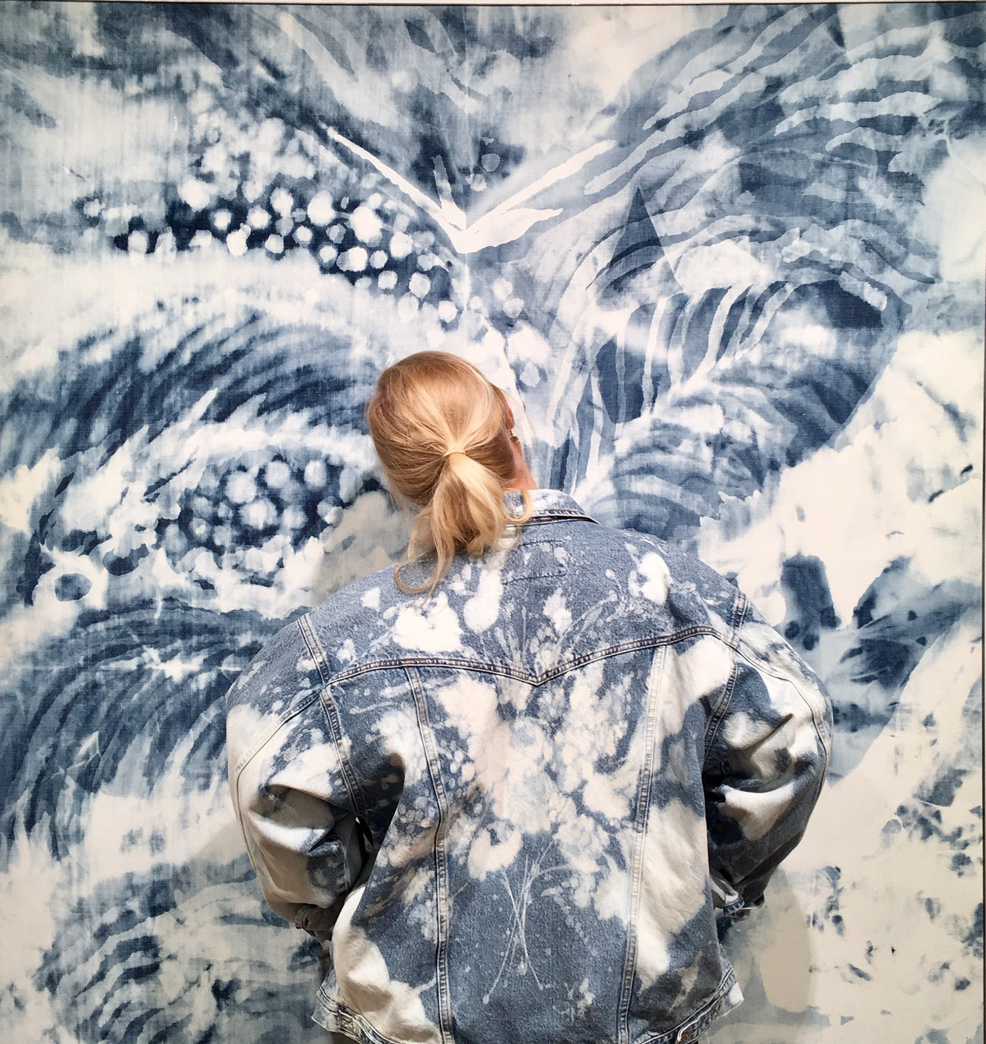 Chlorine bleach on denim, stainless steel frame / 170 x 140 cm / 66.9 x 55.1 in (framed)