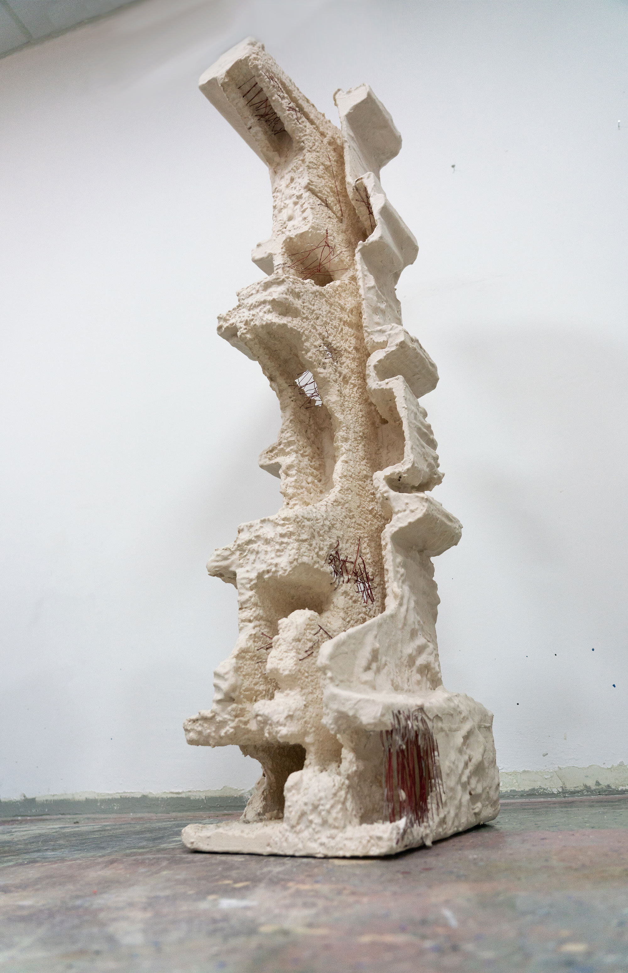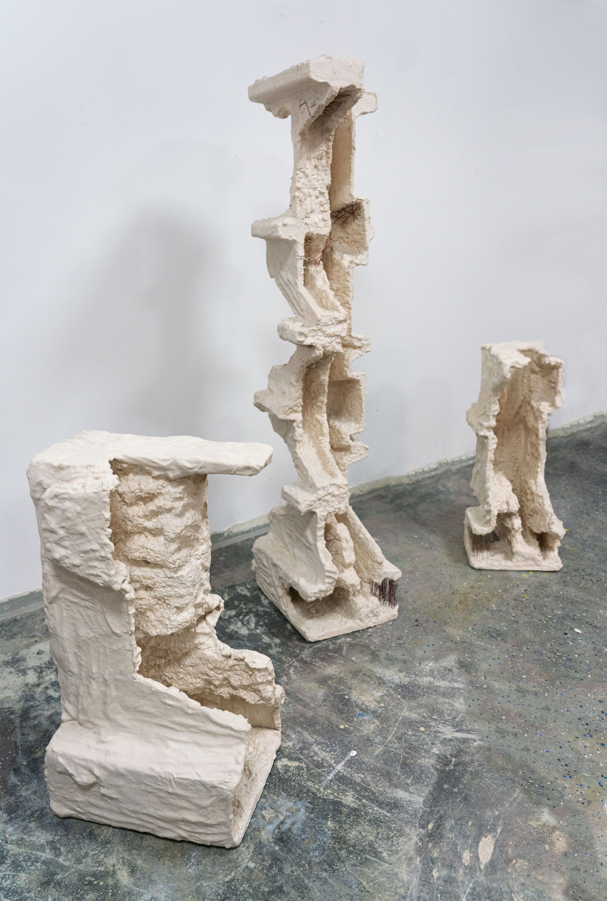"With these pieces I intend to investigate concepts of acknowledgment. Create objects that reflect aggression but continue to function as independent and standalone objects. The base made of foam is covered with plaster, fiber glass and aqua resin. I always tend to add layers on my sculptures and some times adding human aggressive marks to show the depth of suffering and how secrets and untold stories eventually always come out."