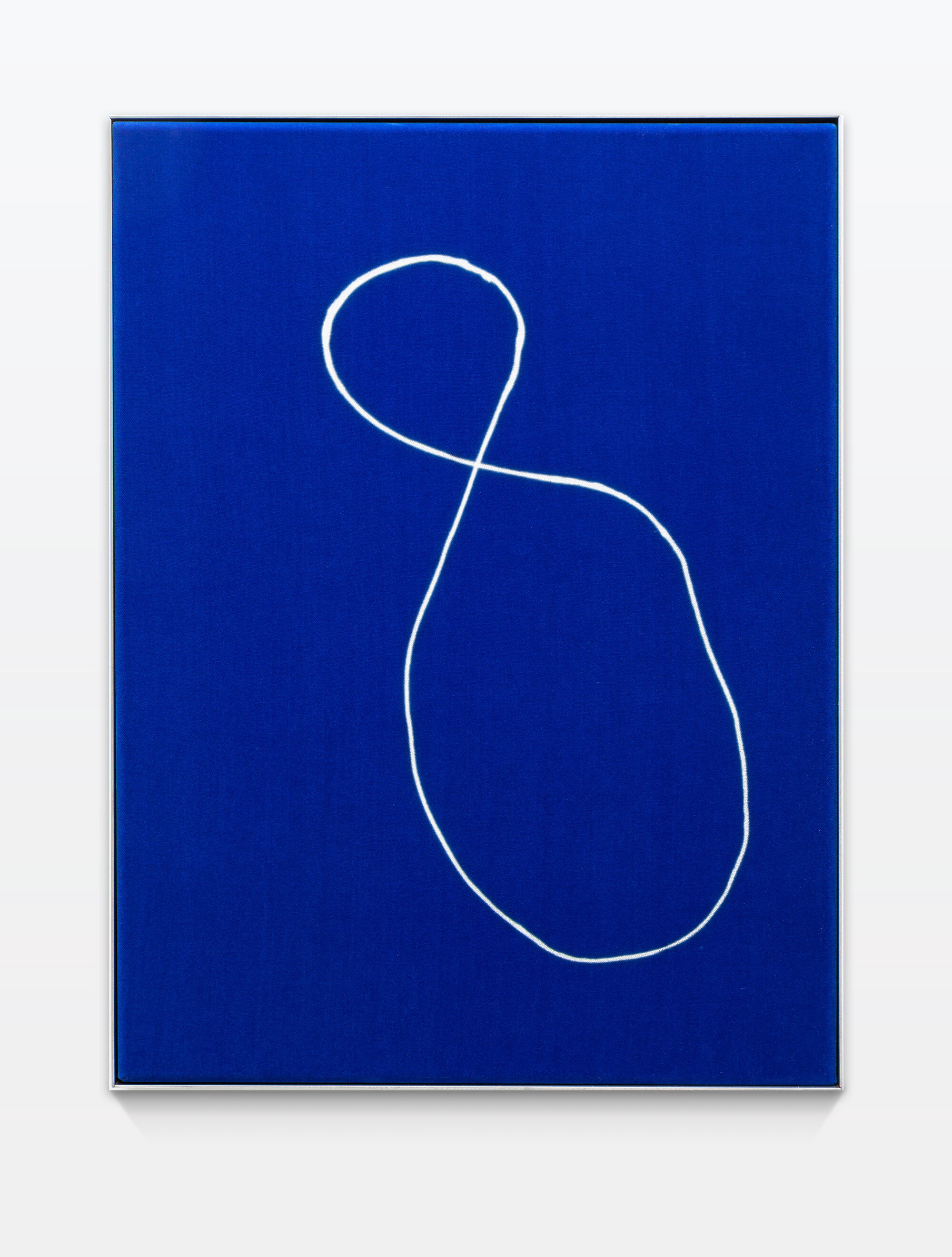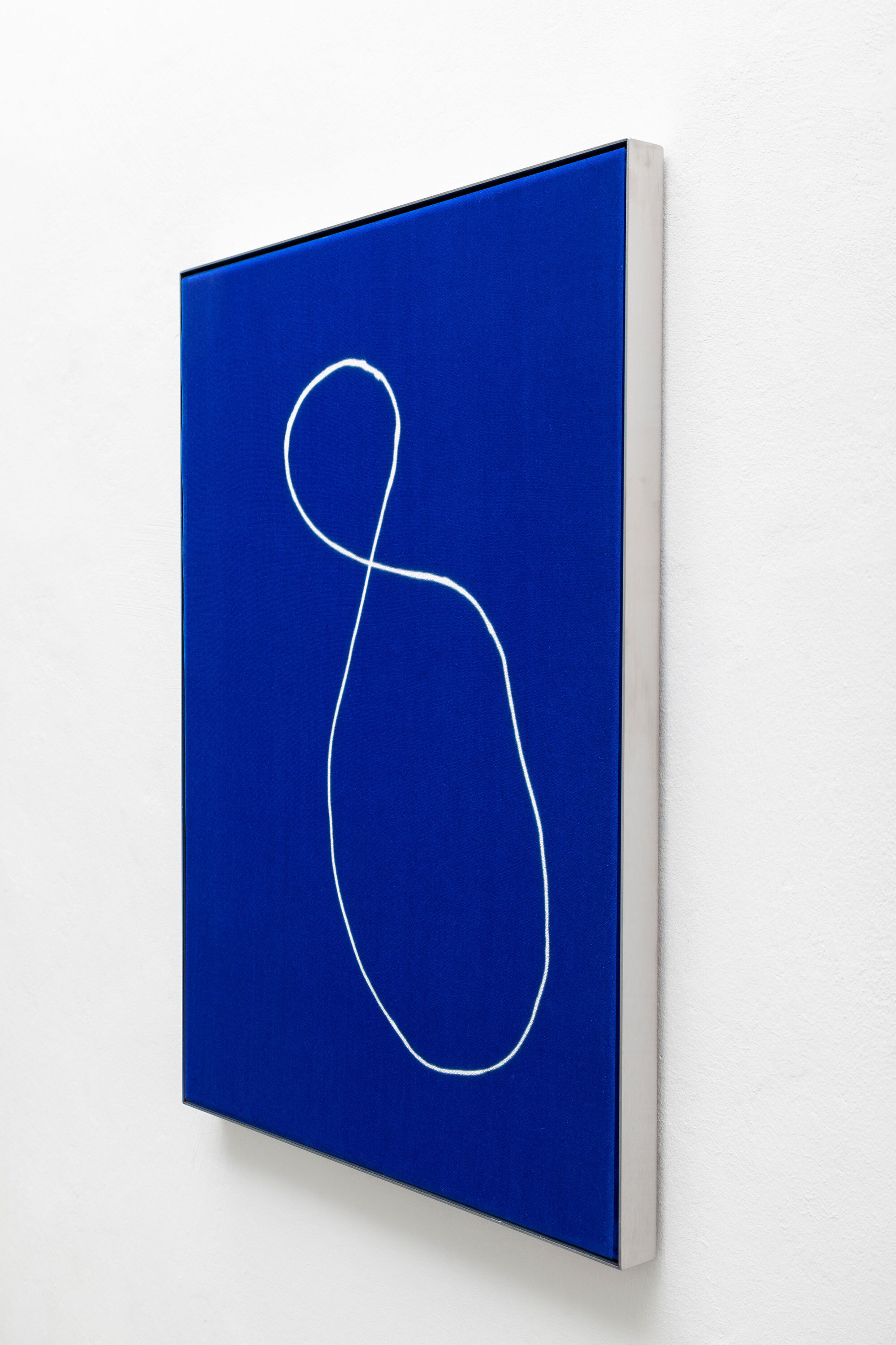 Chlorine bleach on denim, stainless steel frame / 170 x 140 cm / 66.9 x 55.1 in (framed)