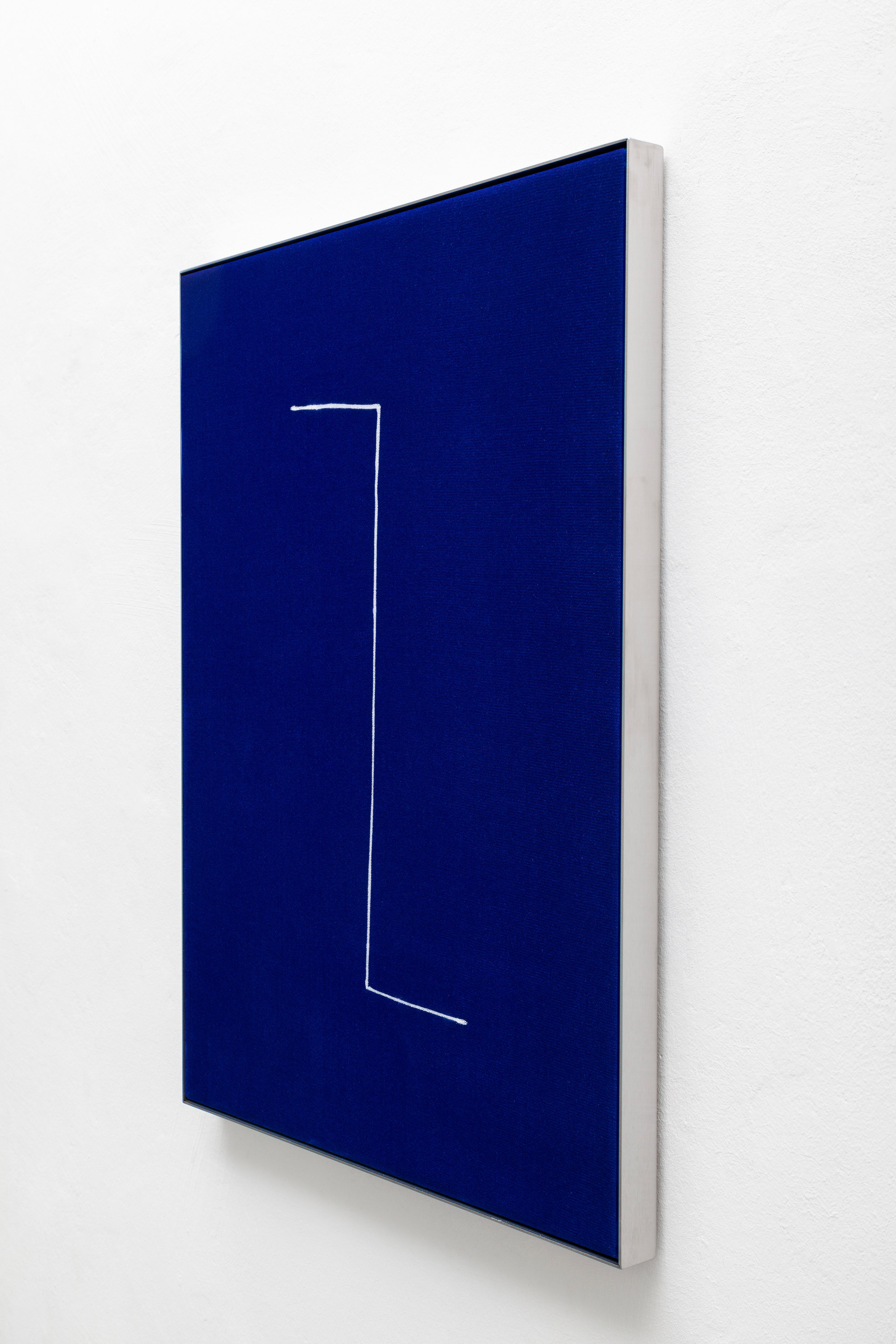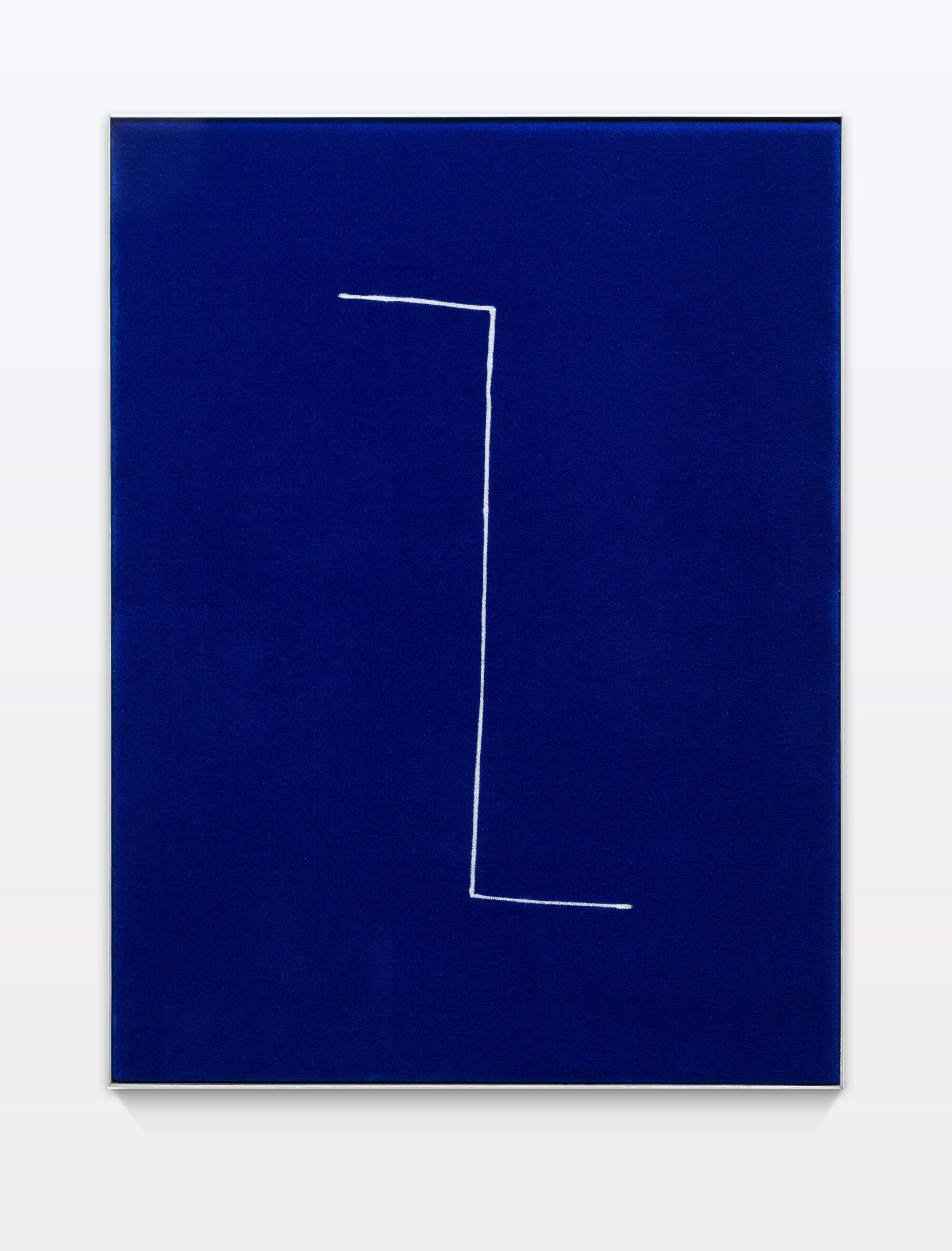 Chlorine bleach on denim, stainless steel frame / 170 x 140 cm / 66.9 x 55.1 in (framed)